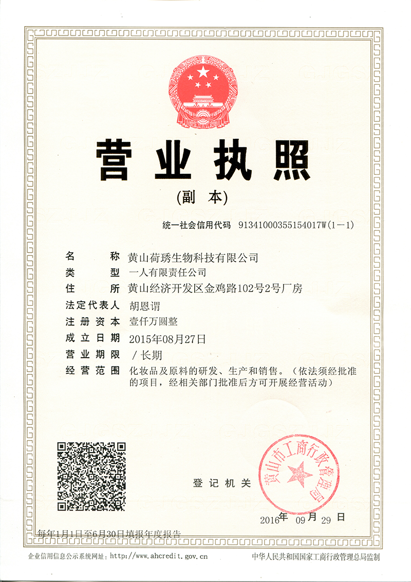 2015年8月27日,黃山荷琇生物科技有限公司正式成立于黃山市黃山經濟開發區,是黃山市首家現代標準化的化妝品生產經營企業。